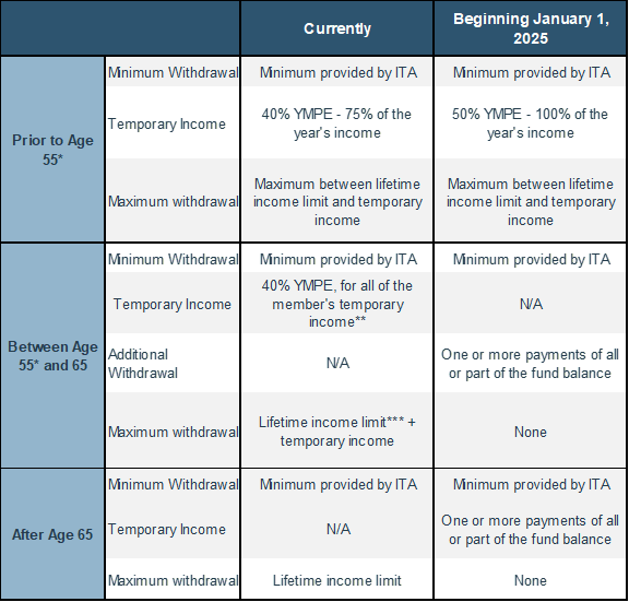 Currently, amounts invested in retirement vehicles such as LIFs are locked in and subject to annual minimum and maximum withdrawals until the person reaches age 95. Additional withdrawals, called temporary income, are, however, permitted before age 65, under certain conditions, up to a maximum of 40% of the year’s maximum pensionable earnings (YMPE).